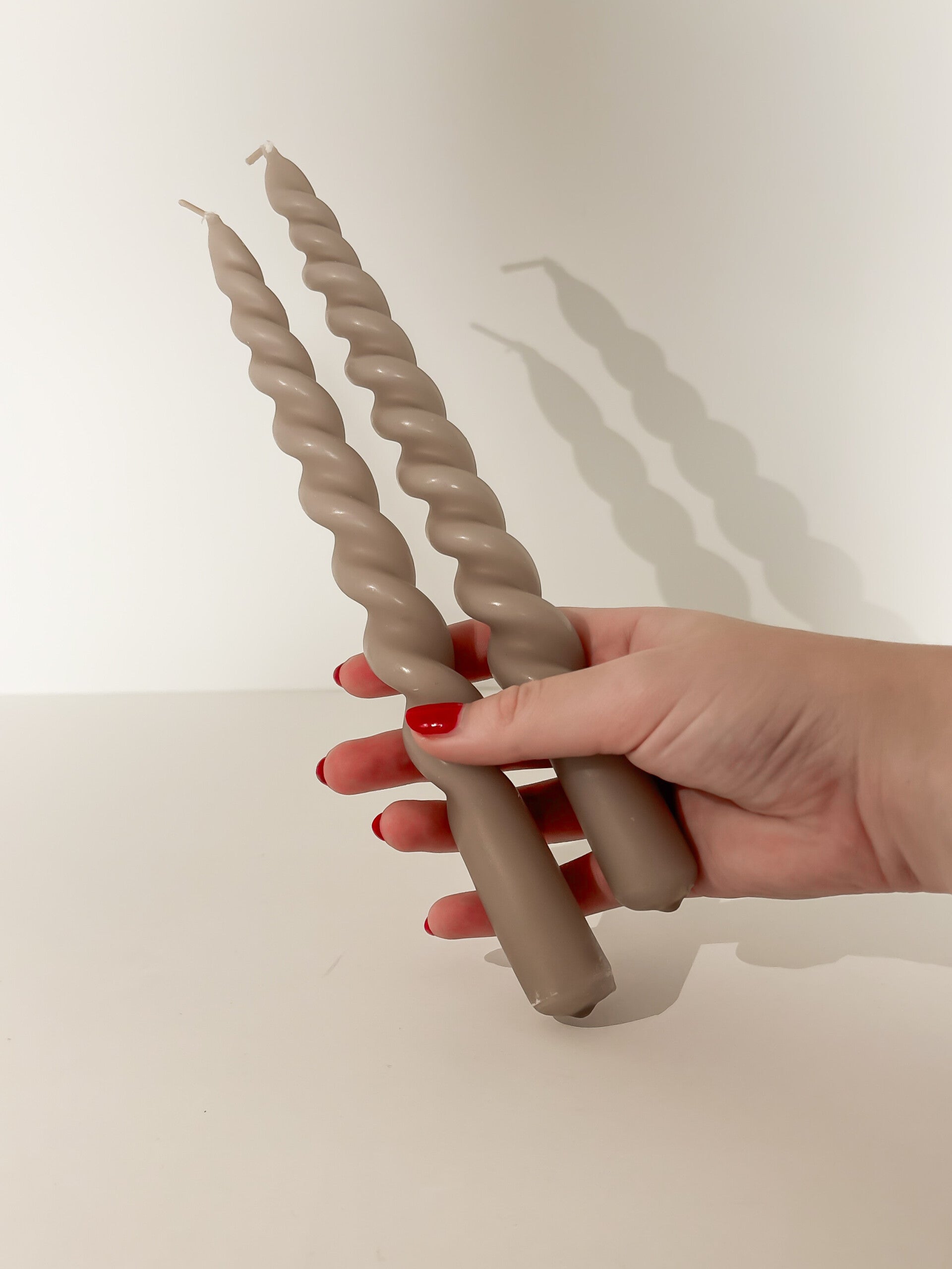 Set van twee, gedraaide kaarsen in een beige kleur. Perfect als decoratief accent of sfeermaker.