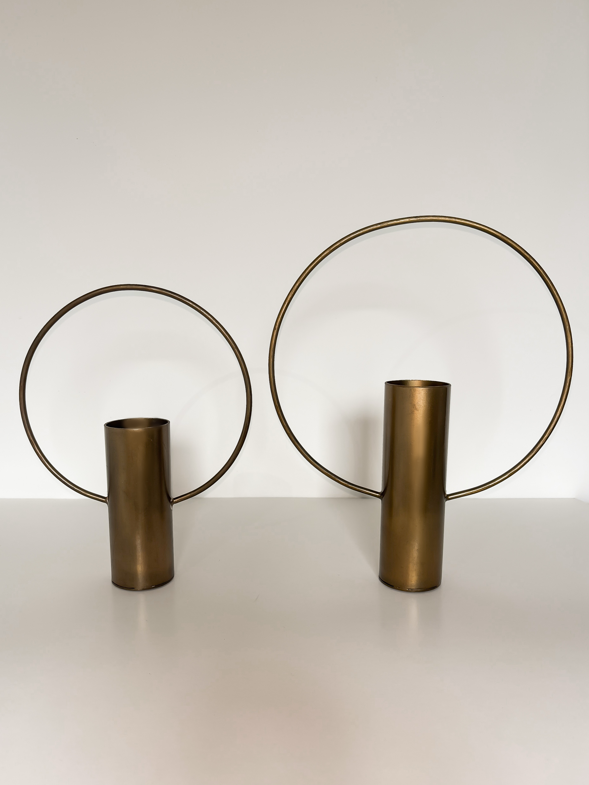 Twee elegante metalen vazen, met een opvallend cirkelvormig design dat een speelse twist geeft.