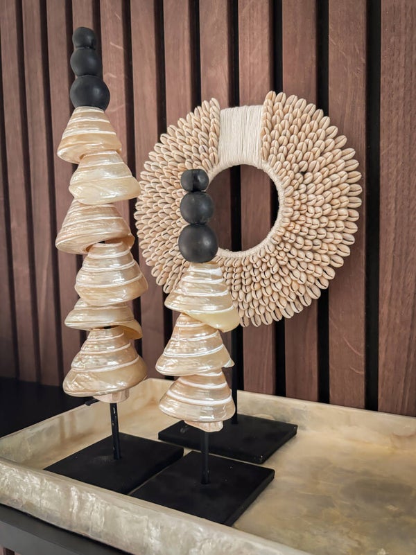 De Shell Tower is een uniek decoratief object dat natuurlijke elegantie combineert met een moderne uitstraling. Deze toren bestaat uit een speelse stapeling van glanzende schelpen in warme parelmoertinten, afgewisseld met zwarte houten kralen voor een stijlvol contrast. Het geheel staat stevig op een zwarte standaard, waardoor het een opvallend accent vormt op een kast, dressoir of sidetable.